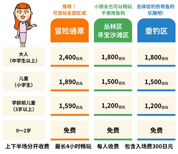 在全长100m(36米×3水道)的池子里尽情寻宝吧!找到的贝壳和宝石全部可以带回家!
